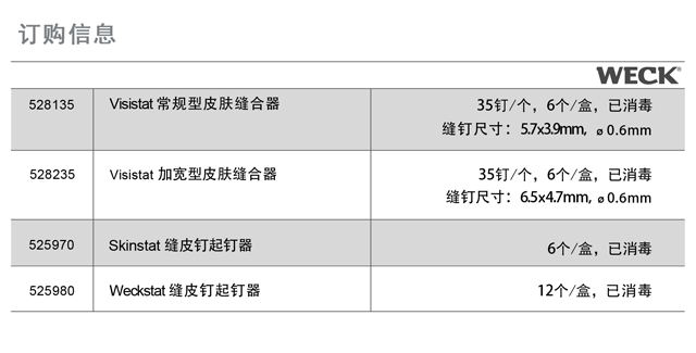 每一個威克皮膚縫合器采用35個標準或加寬型醫用級不銹鋼釘,使得此皮膚縫合器被廣泛應用于各類外科手術中。